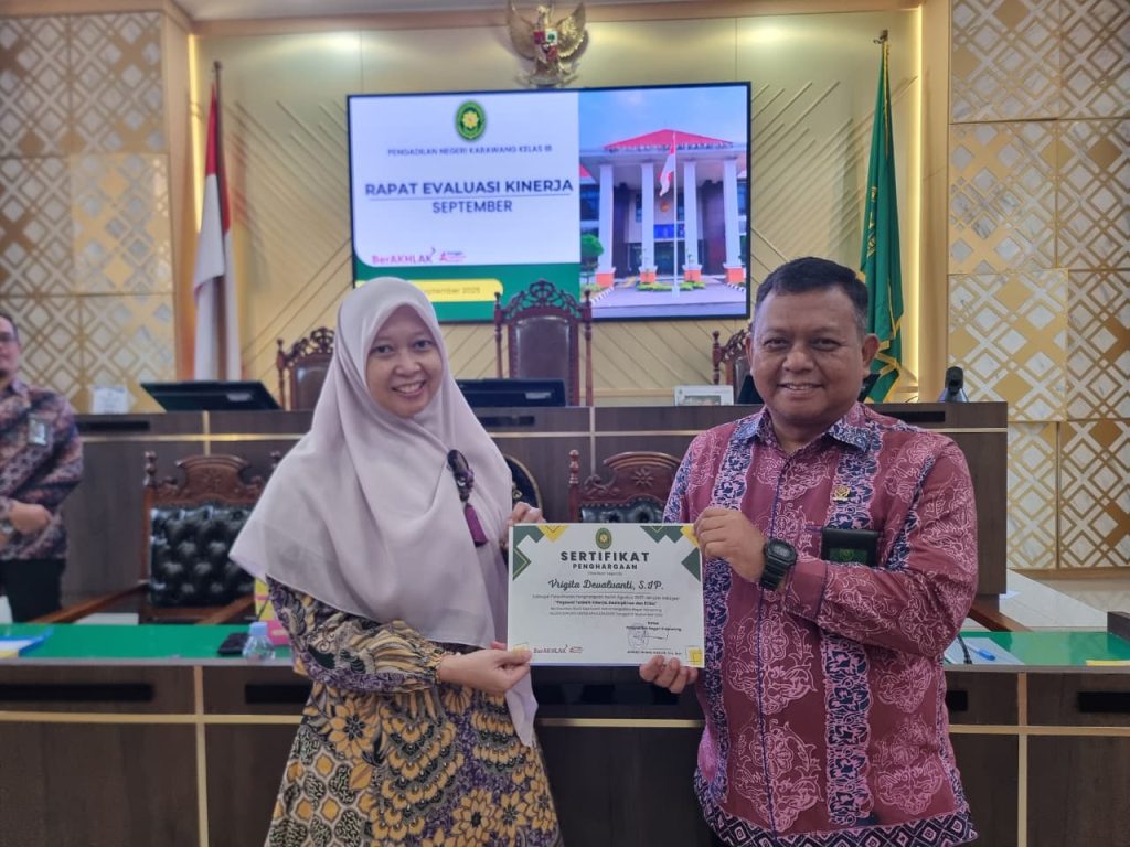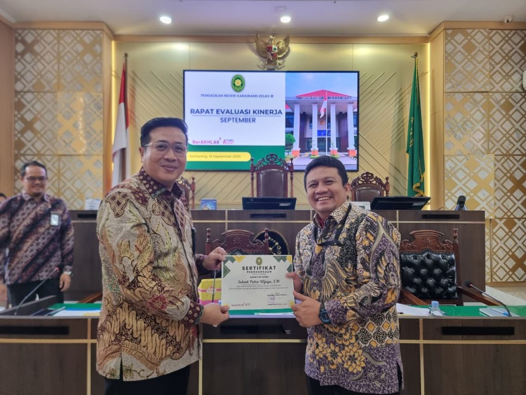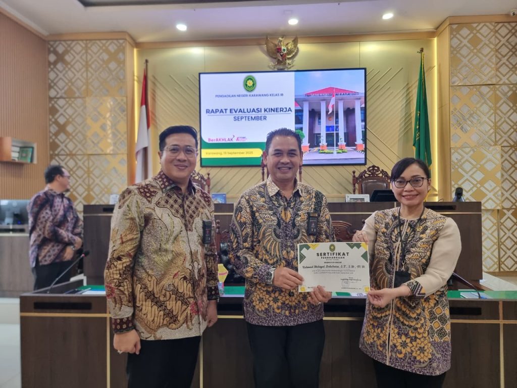 Karawang (Jumat, 19 September 2025) – Pengadilan Negeri Karawang kembali melaksanakan rapat rutin evaluasi kinerja bulanan sebagai bagian dari upaya peningkatan kualitas pelayanan dan tata kelola lembaga. Rapat evaluasi untuk kinerja bulan September 2025 ini dilaksanakan pada hari Jumat, 19 September 2025, bertempat di Ruang Sidang Utama Pengadilan Negeri Karawang.