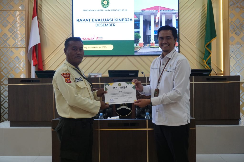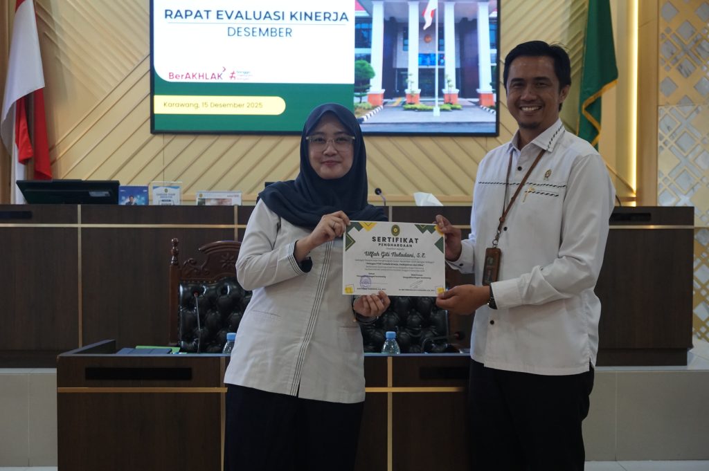 Karawang (Senin, 15 Desember 2025) – Pengadilan Negeri Karawang melaksanakan Rapat Evaluasi Kinerja Bulan Desember 2025 yang dirangkaikan dengan pemberian penghargaan reward kinerja Bulan November 2025. Kegiatan ini dilaksanakan sebagai bentuk komitmen berkelanjutan dalam meningkatkan kualitas kinerja aparatur serta pelayanan publik di lingkungan Pengadilan Negeri Karawang.